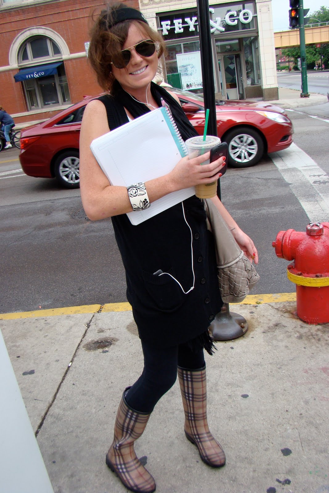 ... The following day, en route home from from the Wells Street/Old Town Arts Fest, I was walking down North Avenue and ran into 'Flip Bike Travis,' who I'd photographed on Division Street around this time last year. Travis, who can always be seen in action on YouTube, reported among other things that he was Michelle Mazda  | going to the art fair to perform a few flips but waiting for the pavement to dry up first. I then continued on my way and met Loren, of Lincoln Park, who was waiting for the bus and looking fashionable in Burberry rainboots.