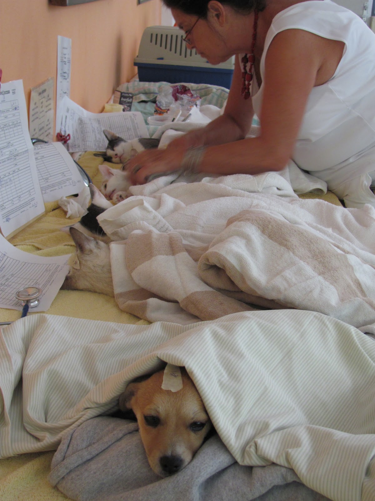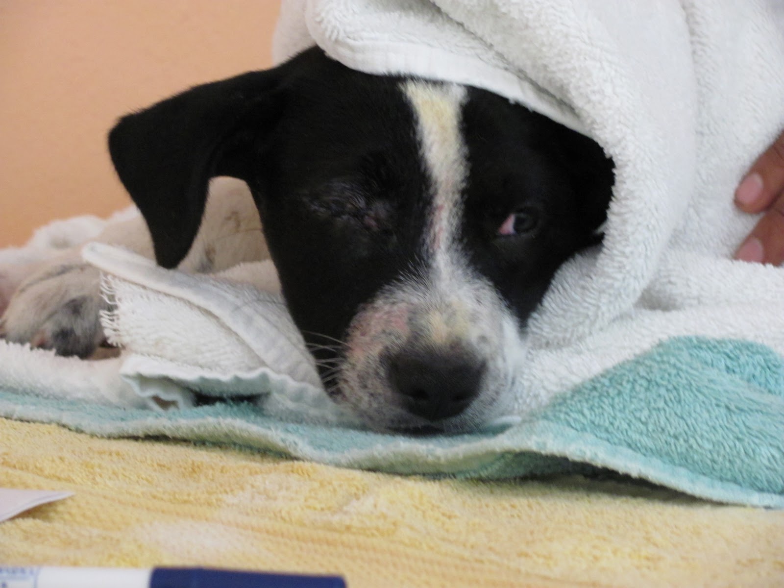 This litter guy had been in a dog fight earlier in the week and lost an eye. The vets were able to successfully operate and stitch the socket back up, so he will never have to be live with an agonizing infection. He is just waking up as sweet volunteers look after him lovingly.