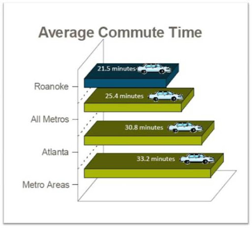 Here's something to think about on your - probably short - commute home: you're saving time just by living and working in the Roanoke Region. According to estimates from the 2006-08 American Community Survey, the average commute in the region is below the national mean with a one-way travel time of 21.5 minutes (though many of us enjoy drives far shorter than that). That compares to 24.4 minutes among U.S. metropolitan statistical areas.  Let's say you could save 10 minutes a day each way in the Roanoke Region for five days, 50 weeks a year. That's 83 hours - or two weeks of work-day hours spent commuting. It's like having an extra vacation every year. We call it Roanoke Standard Time. Recent transplants call it heaven. Just ask Sean Kosmann with Gridpoint, an energy-management company with a significant operation in Roanoke. His average commute in northern Virginia was 40 minutes. Now it's down to 15. What does he do with the savings? "My extra time is spent working out and spending more time with friends," he says. "I love the atmosphere here and the fact that you can have the city appeal in terms of accessibility and stores, but not have the city traffic." It was Sean's brother, entrepreneur Jason Kosmann, who liked Roanoke so much he encouraged Sean to move here. Jason set up shop in Roanoke, leaving Atlanta's traffic behind. "The commute was long and very frustrating," he says. "My commute used to be about 45 minutes to an hour to get to my job and over an hour and a half to get into town. Now I can get anywhere in 15 minutes. It's great!"