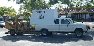 I went out to breakfast the other day and spied this truck. I started laughing and I had to get a shot of it. Chip It 4 Less, indeed. I'll bet you can get 3 or 4 small shrubs in there with no problem, or maybe a few tree branches at a time, then off to shovel unload it and go back for a few more branches while sitting on the jounce bumpers all the way back and forth. Ridiculous. |