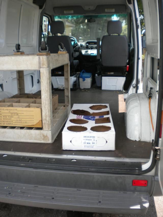Katerack and Durarac for caterers, florists, and contractors:Catering Package Features:Rear facing sliding shelves; capable of 300 pounds capacity each.The shelving is infinitely adjustable up and down to customer needs. In other words, each sliding shelf can be adjusted to vertical spacing based on individual needs and is easily changed by the customer as needed.This product is more than a great idea; it offers the commercial customer these benefits: The bottom shelf can be spaced up off the floor to allow storage on the floor for stepladders, etc. Or the bottom sliding shelf can be adjusted near the floor allowing heavy materials such as tool boxes to be loaded and unloaded easily, without straining the back. Florist Package More compact payload, the big loads can be secured into a smaller space. This could mean a smaller van. When it comes to flowers, more flowers can be delivered in each van, because the shelves can be loaded vertically, one over the other, this is new! Most florists now deliver with all products setting on the floor. There is no center aisle such as used in full size van side racks and bins. This being wasted space. The installation of these traditional systems in smaller vans makes them very cramped and basically inaccessible. Think like the customer, given the option, which one will you choose?Side Mounted Shelving - Obsolete? The rear facing Katerack shelves can be accessed from outside the van, also leaving open space behind the seat for storage of taller flower arrangements.Tall Flowers behind Seat Delivery Control options include dividers and bins as well as a pin and grid system which will keep the wedding cake from sliding during delivery, and keeping the flowers upright! No need to improvise the support for each unique delivery, the system is adjustable to support each unique item.Example of Delivery Control System Preparation - The Old Way Loaded Flowers - Old Way