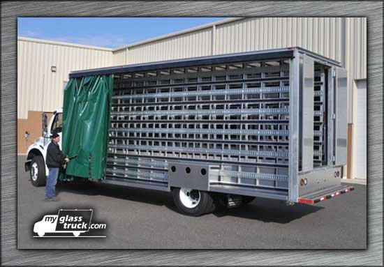 MyGlassTruck.com builds quality glass carriers in a wide variety of sizes and uses and here is their 24' Curtain-Side Glass Truck. The Curtain-Side Glass Truck features custom-built, full-length exterior and interior glass carriers inside a 24-foot curtain-side truck body. Rubber padding from top to bottom of vertical posts gives superior glass protection along with the 2-inch wide padding that runs the full length of the horizontal slats.