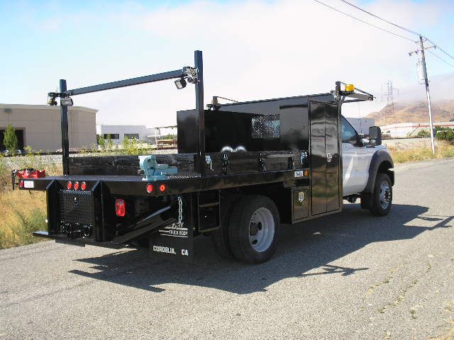 Here's another unique custom flatbed manufactured by North Bay Truck Body. This one is built on a Ford F550 chassis sold by Ron DuPratt Ford in Dixon, CA. The bed includes a 12' flatbed with crossbars on 12" centers and 1-1/8" Apitong hardwood flooring for 10' of the 12' length, with the remaining 2' covered with 1/8" diamond plate steel. It also sports a 3"x2" HD material rack with no long bars and includes Rack Straps with special lights for night work. Strobe lights are attached to the front section of the material rack.