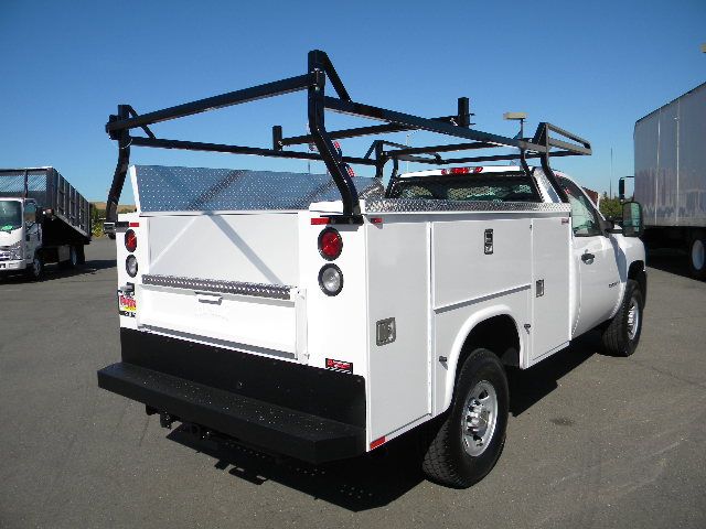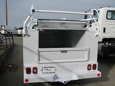The Body is a Knapheide 8' Service Body with the Electric Master Locking System, Hitch, Window Guard, Forklift Loadable Rack and was installed locally by Carter Industries of Union City, CA. The electric master locking system uses a key fob to lock and unlock all compartments and also has a separate key point near the top behind the first compartment in the photo in case the key fob battery is not functioning or the key fob is not available, and it uses the same key as the service body doors.
