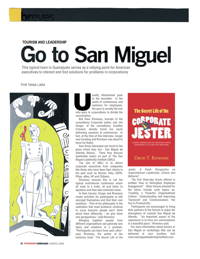 A nice article about Corporate Jester and the San Miguel Leadership Institute (SMLI) was published in the August issue of Expansion, the popular CNN affiliated Mexican Business Magazine.