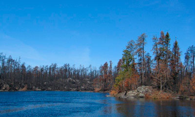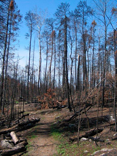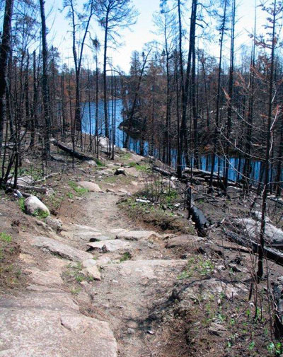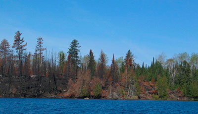 We want you to know that this area is just fine for travel. It's very interesting to see the results of a "fresh" fire. Some plants are already coming back as you can see by a few photos. This whole area was NOT totally torched, just so you know. The heaviest burn was on Lake Four, Hudson, and the southern part of Insula. Walking the portage from Hudson to Insula is right through a burned area and is amazing. Travel is safe and I hope you take advantage of this entry point sometime. I completely recommend the Lake One to Snowbank (or reverse) loop this summer. You will see the burned area and a lot of the forest that is just as you would imagine. - tall green trees and stunning beauty.