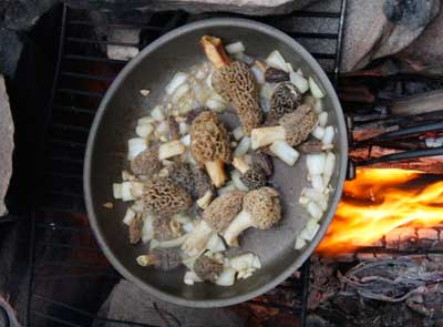 Morels Up After the Fire I've heard about this phenomenon for years and yesterday Nancy and I had time to get out of town and check it out. The word is that morel fungi come up profusely the year after a forest fire has ripped thru a forest. No one seems to have an explanation why it happens but it seems they are right. We found morels yesterday. Well, she found morels. I must have been wearing the wrong sunglasses or something cause Nancy found 10 times more than I did. I think her shorter stature helped as the black species seemed to pop up underneath burned out tree stumps. That's my excuse and I'm sticking to it. I did find a few of the big yellowish colored morels that grow more out in the open and stick out like a yellow lollipop on burnt over soil but of course even those I was sadly lacking in my bag compared to hers. Oh well, I need more practice. The cooking of these morels was a bit of a challenge. Coming up thru sandy soil with little or no organic cover left the porous fruit rather sandy. They took some real washing to get the grit out and even then there was a crunch or two in the eating and final phase of a morel day. That is the big reward though with any morel forret, they are yummy as any fungus you can imagine fried with onions in butter and a little cream over the top. Man, you can't imagine how good they are unless you've tried em. So the morel of the story is; take note of this year's forest fires and go there the next spring with basket in hand to bring home a real epicurean delight. The season may be just about over in our big Pagami fire zone from last fall but the forest was ablaze just a couple weeks ago only ½ mile out of Ely so next spring - Don't tell anyone though. Let's keep that our little secret excuse for a walk in the blackened woods next May and June. Steve Piragis