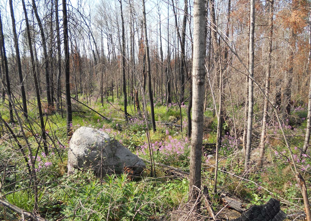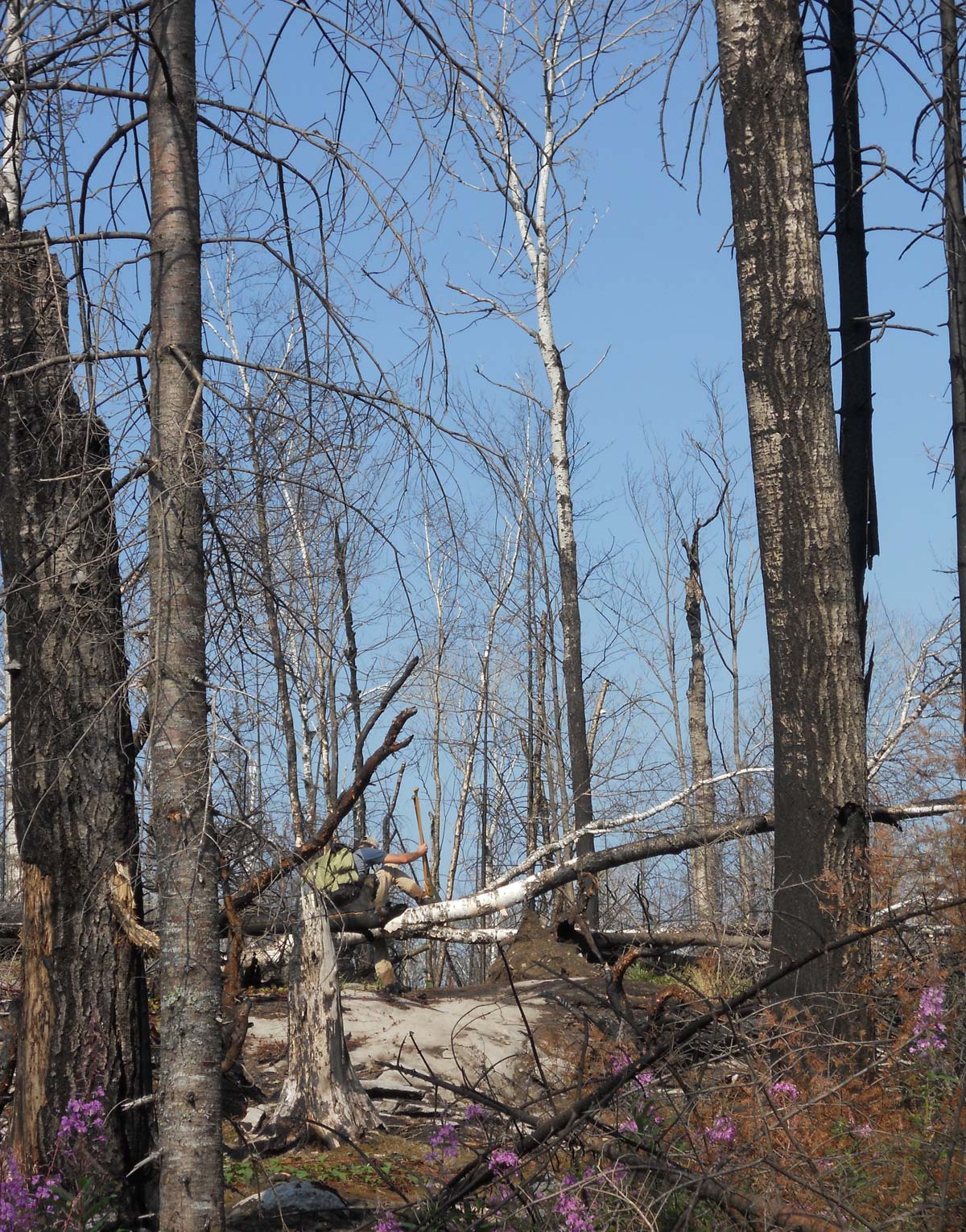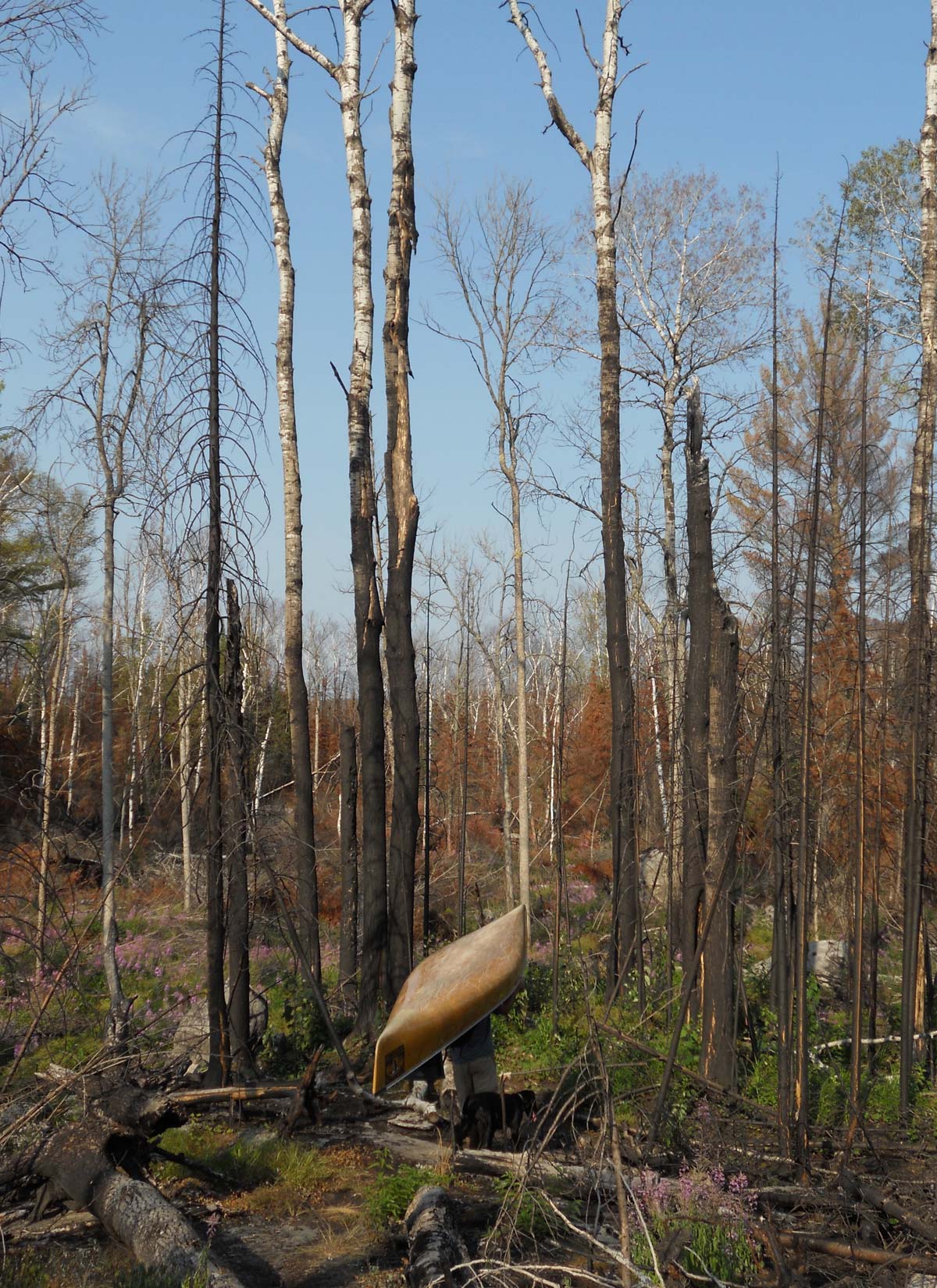 Recently Drew and Adam and Agnes paddled and portaged into the area affected by last year's forest fire. These pictures are from the portage (approx. 280 rods) from Clearwater to Judd on the Northeastern route to Rock Island Lake. Notice the abundance of flowers and green undergrowth. Drew noted quite a few trees with split bark their entire length. Very interesting shots!