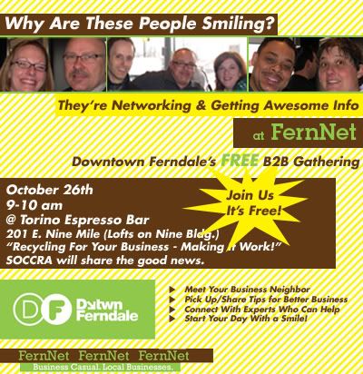 Downtown Ferndale's B2B networking opportunity happens from 9 - 10 am, Wednesday, Oct. 26 at the Torino Espresso Bar, located at the corner of Bermuda and East Nine Mile Road.