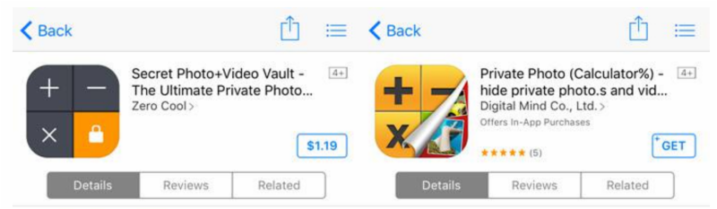 "Ghost apps" are apps that are disguised as innocent apps--such as calculators--but are actually secret photo storage vaults. Examples of these apps include Private Photo Vault, Secret Calculator Folder Free, Calculator%, Photo Vault & Video Lock Safe, Hide It Pro, and Vaulty. The app may look like this: