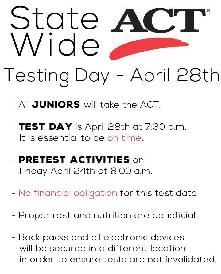 In addition, all juniors will participate in state wide ACT testing on April 28th.