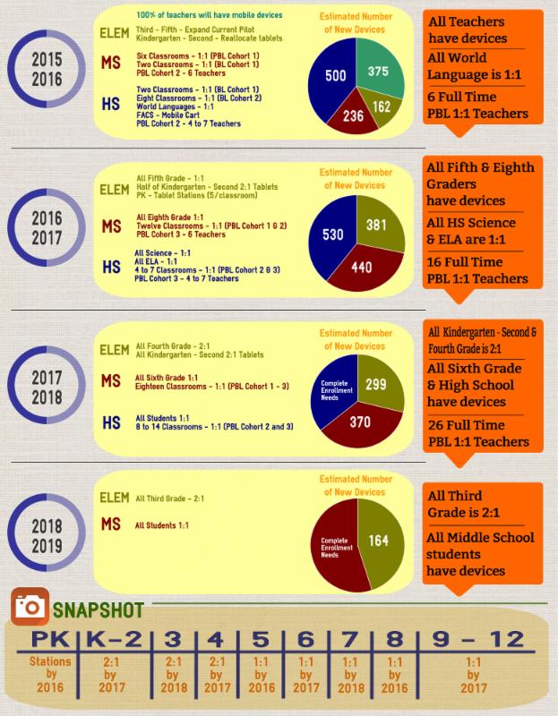 The below logo and slogan were created for two reasons: 1. We feel our district teachers are "READY" for and seeking expanded technology to enhance the classroom experience for their students. 2. It is vital that our focus be on getting our students prepared for life beyond high school, and technology is a large piece of the puzzle. They must be READY for the global world awaiting them by having the skills necessary to navigate and connect through technology in order to be competitive in the workforce. The mission, vision and purpose of the RepMo Ready plan are listed below as they are the driving force behind this implementation. It is vital that the device be viewed as a tool in enhancing the educational experience for our students, it is not the end point. To ensure this, the district has created a plan that focuses on getting teachers the resources and ongoing support that they need from both the Curriculum, Instruction and Assessment and IT departments. The district is dedicated to being 2:1/1:1 by the 2018-2019 school year. This means that every student (or every two students in the lower grades due to developmental needs) will have their own device to utilize for school work. Below outlines the timeline with specific information on PBL (Project Based Learning) and BL (Blended) integration--two instructional techniques that will begin being expanded in our district--more information to come on this! The very bottom indicates a snapshot view of technology expansion from preschool to high school and the associated implementation year.