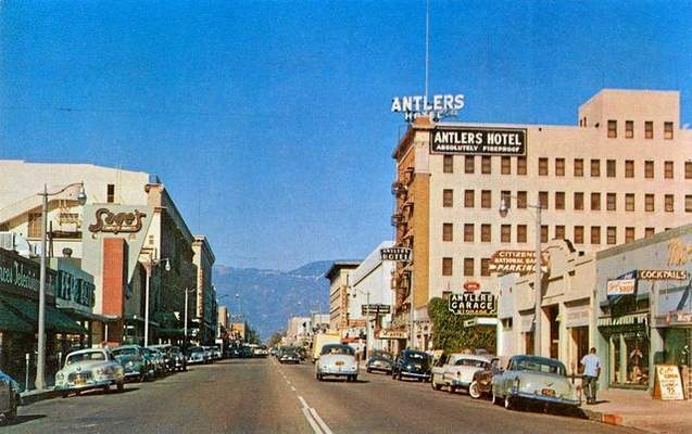 Postcard view looking north on E Street, circa 1953. The Antlers Hotel is at the right, displaying the prominent "Absolutely Fireproof" sign.