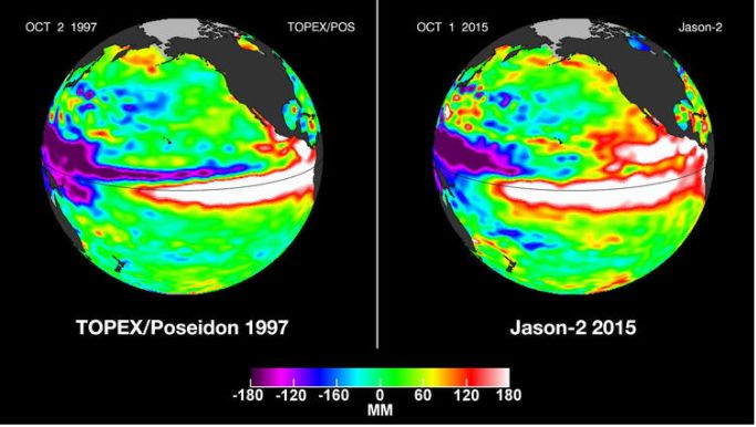 Satellite images comparing Oct. 1, 2015, and Oct. 2, 1997, show large areas of white, which indicate high sea levels -- a reflection of high sea temperatures. The images show how this year's El Nino could be as powerful as the one in 1997, the strongest El Nino on record.