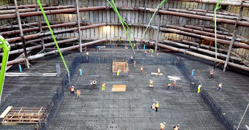 In November, the project began with a massive concrete pour. It took 18 hours to pour concrete down a currently empty hole to create a 14 feet thick concrete slab.