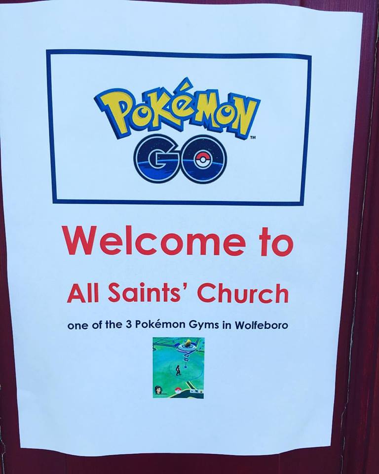 The Pokémon Go craze comes to us from the Nintendo-owned franchise, which produced colorful cards and later video games, is back - this time luring young adults out of their apartments and into museums, parks and places of worship, including All Saints' Wolfeboro. Pokémon's newest iteration is a free augmented reality app that brings its now-adult fans' fantasies to life. The app uses players' phone GPS to locate where they are, then makes Pokémon appear on the phone screen in real-life locations so players can "catch" all 151 virtual creatures. The game's PokeStops and Gyms, are places where players can gather in the real world to capture and battle their virtual Pokémon. All Saints' is a "gym" so if you see guests wandering around with cell phones, welcome them. We are one of three "gyms" in Wolfeboro and if anyone would like the heads-up on the other two, just introduce them to the pastor!