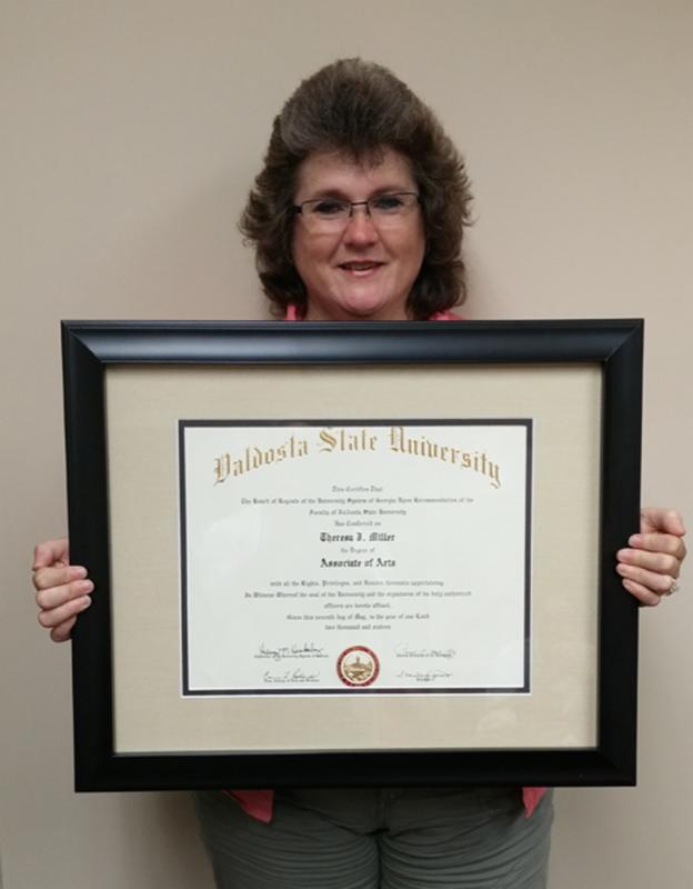 The Board of Commissioners would like to recognize Theresa Miller for receiving her Associates Degree in Business Administration this past June from Valdosta State University on the Kings Bay campus.