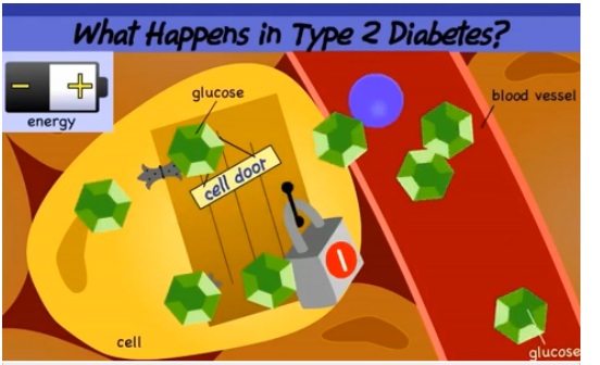 The pancreas can make insulin [blue circle and key] at first. But when the insulin arrives at the cell door, it cannot unlock the cell door. So  glucose [green hexagon] and respondent insulin levels rise. Eventually the pancreas gets depleted from working so hard and becomes dysfunctional. We get fatigued and a host of other issues can emerge because the cells are not getting their needed energy. Pre-Diabetes