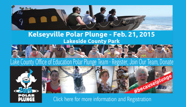 Kelseyville Polar Plunge February 21 Join the LCOE Polar Penguins and plunge into the cold waters of Clearlake on February 21 at Lakeside County Park. The Kelseyville Polar Plunge benefits the Special Olympics of Northern California and Nevada. Even if you can't "take the plunge," you can still participate by donating.