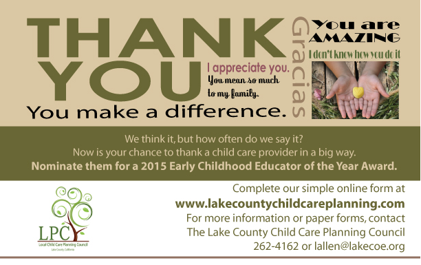 The new year started off with a January challenge to PLAY two times per week with your children. What could be more fun? Currently, we are launching our February ADVOCATE month with the POP (Parent on Purpose) challenge. We are challenging all parents to commit to making small changes in your life that will benefit you and your family. Our Lake County Early Childhood Education sites are our primary targets for connecting with families and we depend on our educators to partner with us to get this information to Lake County families. Go to www.lakecountyheroproject.com to get all the latest information and encourage your families to take the challenge. Our "Play" and "Advocate" literature is available in the LCOE office. Please check with Robyn Bera (rbera@lakecoe.org) if you would like postcards to distribute at your program.