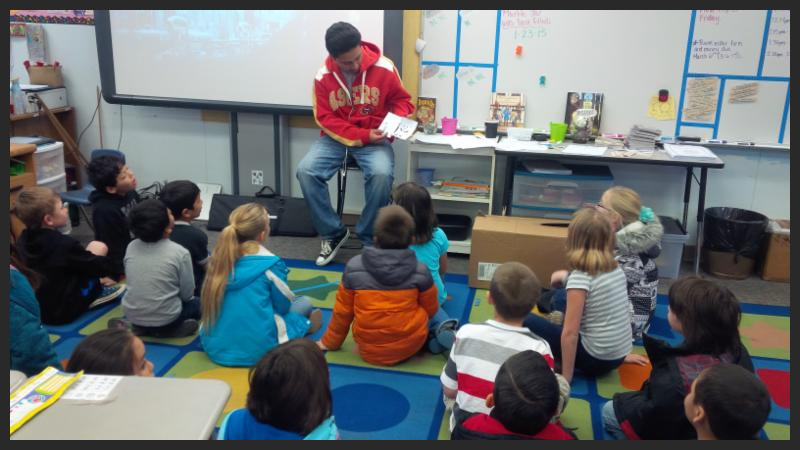 | Juan Castro reading to Mrs. Schmitt's 2nd grade class. |