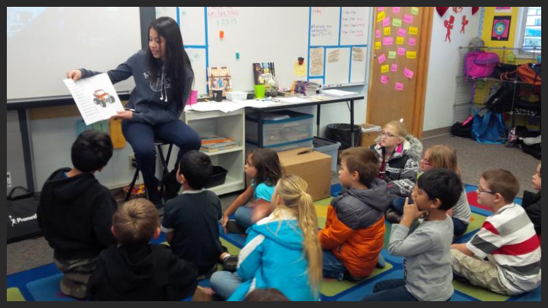 | Perla Gutierrez reading to Mrs. Schmitt's 2nd grade class. |
