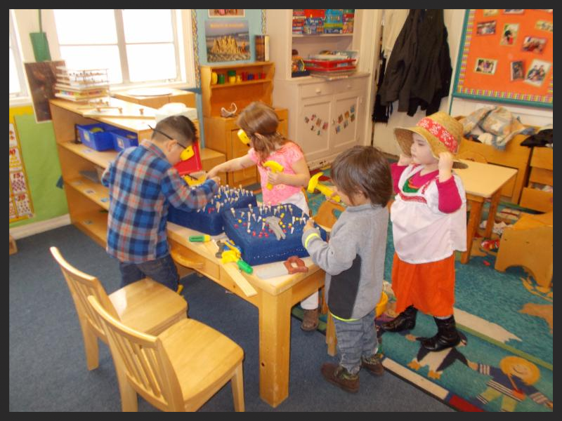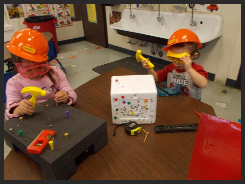 | | Using tools to hammer nails into foam containers! |