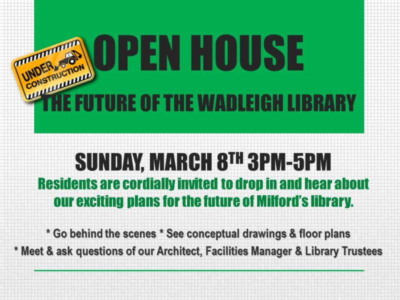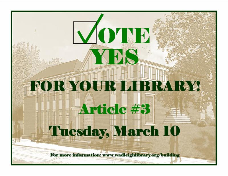Voter turnout for town elections is historically low and the library building project has to receive a 60% majority vote in order to pass. If you want to see this project come to fruition; want a much bigger children's department; a larger teen department; a business/IT center; quiet study rooms; after-hours meeting room access; nearly double the parking spaces, we absolutely need you to vote for them on March 10. If you aren't yet registered to vote, just bring a valid photo ID and you can register on site. Voting will take place from 6 a.m.-8 p.m. at Milford Middle School (33 Osgood Road). For more information about the project, consider attending our Open House on Sunday, March 8th from 3-5 p.m. or see www.wadleighlibrary.org/building. Many thanks for your support! ~ Michelle Sampson, Library Director