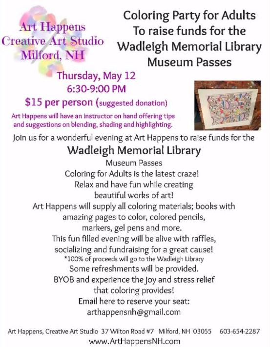 Or, make check payable to: Wadeigh Library Development Fund. Mailing address: 49 Nashua St., Milford, NH 03055.