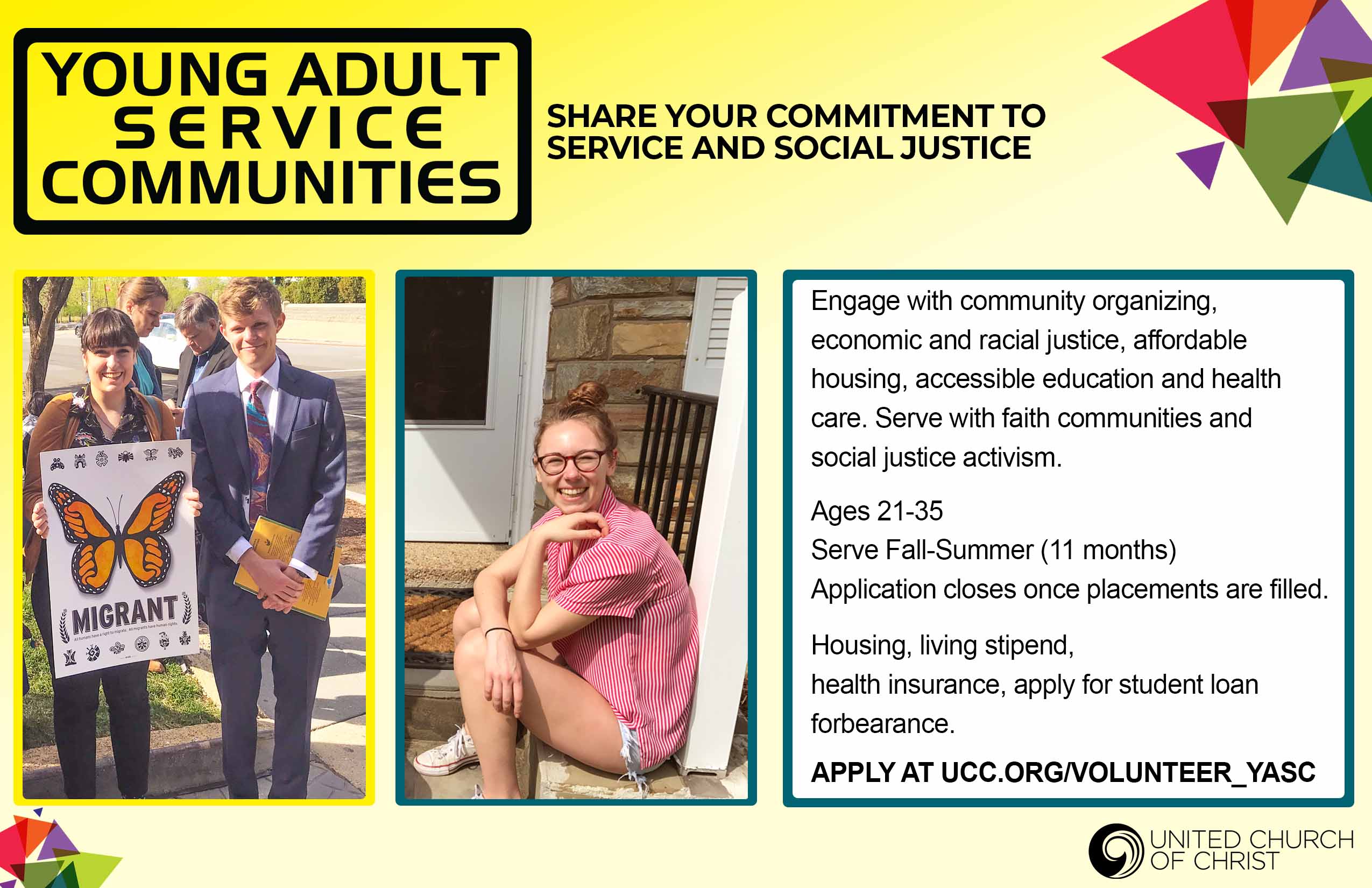 Young adults of Missouri, Tennessee, Arkansas and beyond, ages 21-35 - Are you looking for a way to make a positive difference in the church and world? Just YASC! Excitement is building about the UCC Young Adult Service Communities - one near you or in another part of the country. February is the month for Applications. The service year is September 2, 2014 - August 2, 2015. Inquire today UCC Young Adult Service Communities.