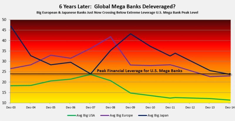 There is a different story, however, on the other side of the world. European mega banks' financial leverage peaked at 42:1, while Japanese banks peaked at 43:1. They weren't using punch bowls back then; they were filling up the swimming pools! Shockingly, six years removed, Europe and Japan have just now crossed down through our dangerously high levels of leverage from 2007.