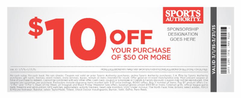 Save throughout the month of March on all Spring Wear, Race Gear & Any Other Sporting Goods! Don't forget about Spring Break needs! Stock up on your supplies before you go! Warmer weather is on the way! We have what you need to make your spring season complete! Shop Sports Authority March 1-31 and save $10 off your $50 purchase!