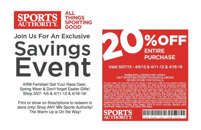 Know Your Strawberries We believe in rewarding farmers for using best practices and delivering positive results. Our Responsibly Grown ratings system for fresh produce and flowers uses scientific input to help you make informed choices when you shop. Our farmer partners are working hard to protect human health and the environment while bringing us (and you) the best strawberries around! Choose berries that are firm, dry, shaped properly and have a uniform deep-red color with attached green caps. Strawberry season runs from February through October with peak availability from May through July. When selecting strawberries, it is important to inspect the packaging carefully to look for signs of wet, leaky berries. Storing Tip: Because strawberries are highly perishable, be prepared to consume or freeze them soon after purchase. Excessive moisture will speed decay, so wash berries just before you serve them. Whole Foods Market Deal of the Month: Cash in on nutrient-dense foods by checking out our online coupons here: wholefoodsmarket.com/wholedeal Visit one of our SIX Twin Cities locations: St. Paul Lake Calhoun (Minneapolis) Hennepin (Minneapolis) Edina Minnetonka Maple Grove Sports Authority  REMINDER! SAVE 20% ON YOUR RACE GEAR, SHOES, SPRING WEAR & ANY OTHER SPRING NEEDS AT SPORTS AUTHORITY! DON'T FORGET ABOUT YOUR EASTER GIFTS!! SHOP 3/27-4/5, 4/11-12 & 4/18-19 AT ANY MN SA LOCATION! ARM Families! 3/27-4/5, 4/11-12 & 4/18-19 all ARM Participants and Families will receive 20% OFF your entire purchase at ANY MN Sports Authority store! Don't miss your chance to stock up on all sports gear, race wear & spring needs for 2015! The 20% savings is good on any purchase so you can stock up the whole family! Plus, don't forget about Easter gifts! We have goodies for everyone in your group! The Spring season has arrived so stock up on all of your warmer weather supplies while saving 20%! Please print the attached coupon or show on your smart phone and redeem in store anytime during the valid dates. For more details or if you can't print attached coupon for the shop weekend please email bsherman@sportsauthority.com