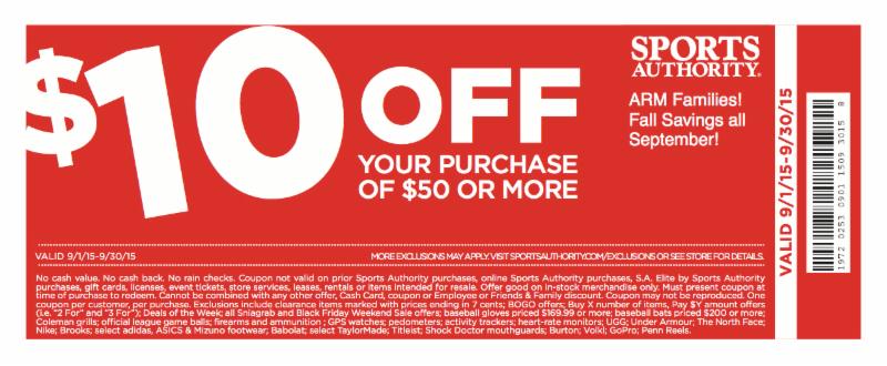 Pick up your race wear and new Fall apparel! Shop ANY Sports Authority and save! Valid 9/01/15-9/30/15. Download this coupon or show it on your smartphone when you check out.