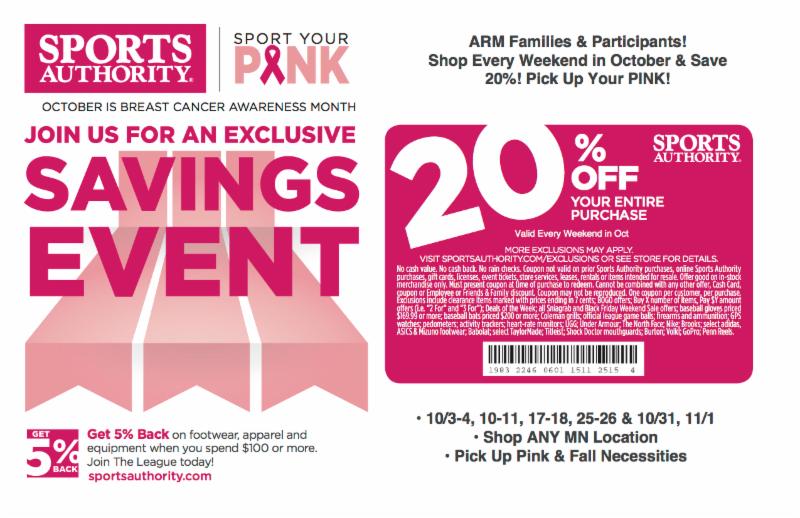 ARM Families and Participants: Shop every weekend in October and Save 20%! Pick up your PINK and any Autumn necessities! Valid at ANY MN Sports Authority location! Download this coupon or show it on your smartphone when you check out. Please email bsherman@sportsauthority.com if you have trouble with the coupon.