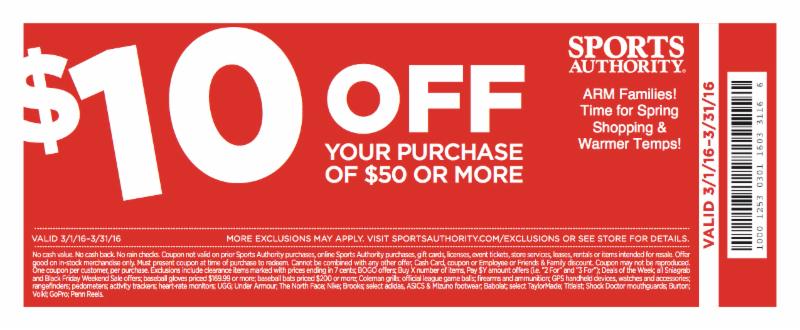 It's time for some Spring shopping as warmer temps are on the way! Gear up for the Spring season and don't forget about any Spring Break needs! Coupon valid at any MN Sports Authority 3/1/16- 3/31/16! $10 off $50 purchases! Click on the coupon below to print.