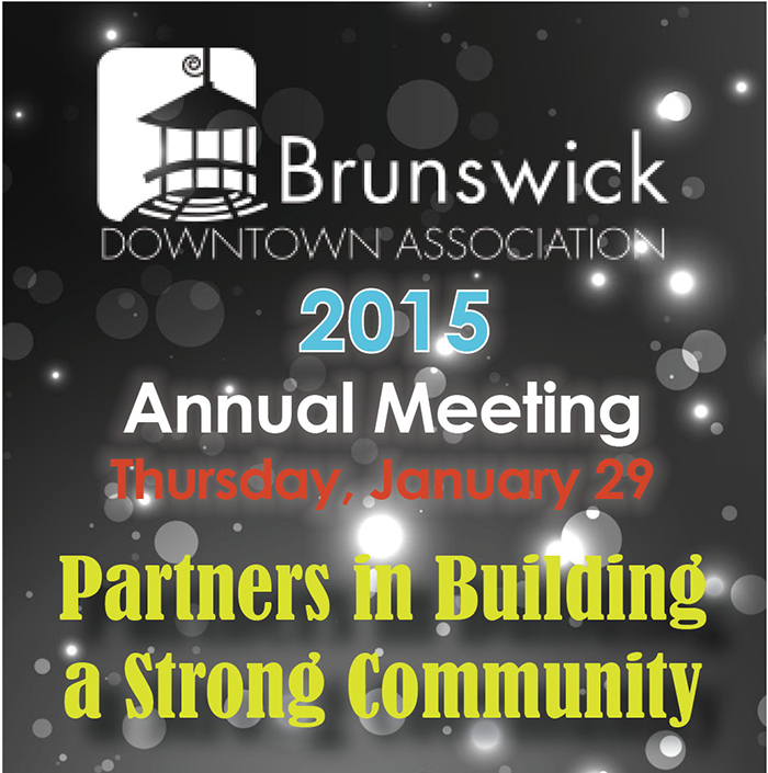 BDA's Annual Meeting - January 29 Register now for The 2015 Brunswick Downtown Association Annual meeting. Our very own Deb King (BDA Executive Director) will kick off the new year with an inspiring multi-media presentation: BDA - Partners in Building a Strong Community! on Thursday, January 29, from 7:30 - 9 AM at Bowdoin College's Moulton Union. Register here.