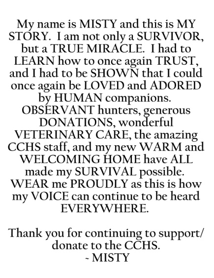 If you've followed the story of Misty, the abused and abandoned dog found in Central Wisconsin in mid-January, you'll be happy to know that her story is taking a positive spin! I'm proud to say that one of our own IMPACT team members, Melissa Goodman, created a fundraiser in Misty's honor, with all clothing proceeds going directly to the Columbia County Humane Society (CCHS). The fundraiser ran for a total of three weeks in February, through a website called Bonfirefunds.com, and collected over $4,000 for the CCHS!