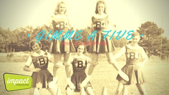 Why the heck do you see everything listed in 5's in our posts? "Top 5 Reasons to Hire a VA," "Top 5 Technologies to Advance Your Business," 5's, fives, FIVES!!!!!!!!!