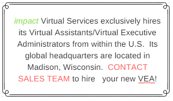 impact Virtual Services exclusively hires its Virtual Assistants/Virtual Executive Administrators from within the U.S. Its global headquarters are located in Madison, Wisconsin. CONTACT SALES TEAM to hire your new VEA!