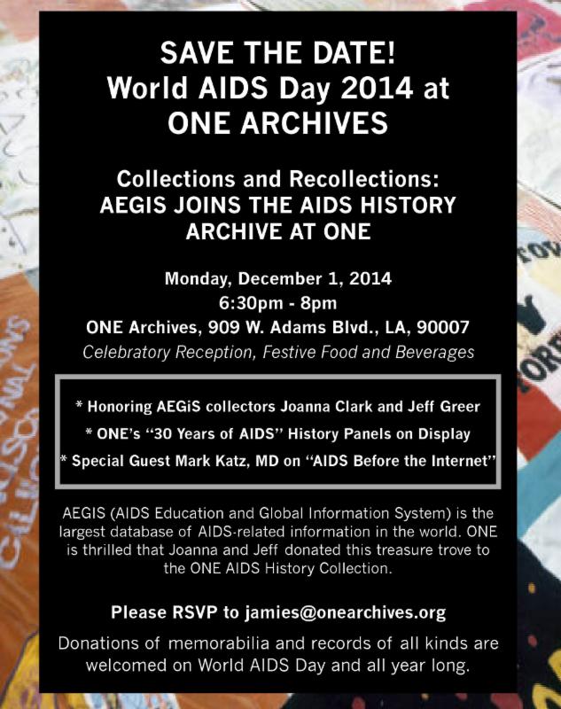 To RSVP to the World AIDS Day 2014 at ONE Archives, email jamies@onearchives.org. To support the continuous growth of the ONE Archives AIDS History Collection, please consider making a donation