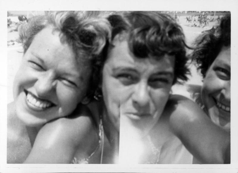 Esther Bentley and two unidentified women taking a selfie at the beach. April 1952. Ester F. Bentley Photographs and Papers. ONE Archives at the USC Libraries.