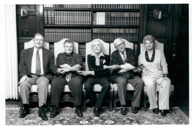 The "Supreme Court Photo" with Robert Arthur, Ivy Bottini, Quentin Crisp, Morris Knight, and Patricia Nell Warren taken at home of Victor Burner. 1994. Photographer unknown.