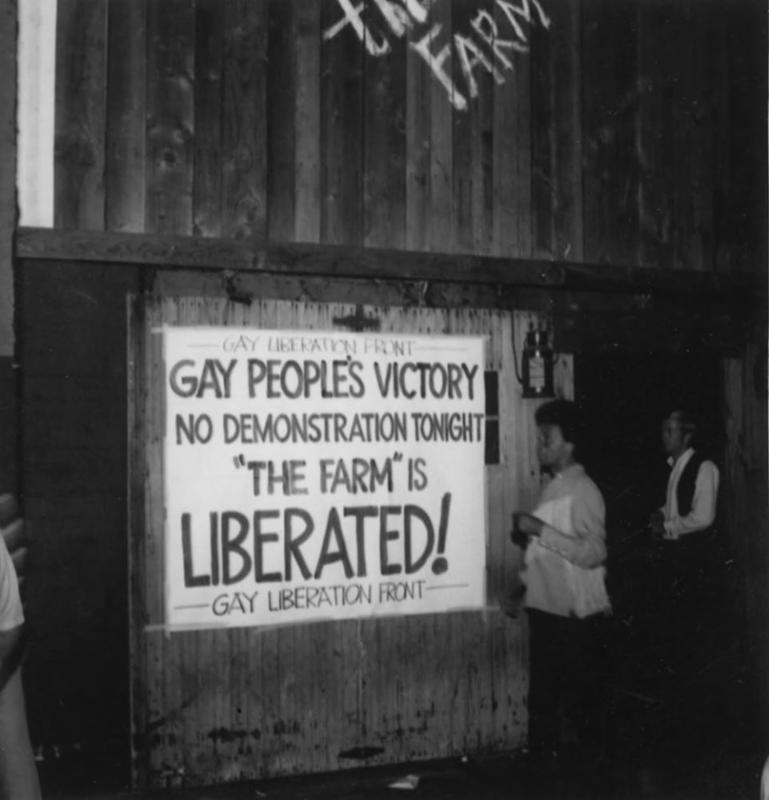 Image: The Gay Liberation Front (GLF) protests forced the owner of the Los Angeles bar The Farm to rescind the no-touching rule prevalent at gay bars at the time. The GLF celebrated by posting outside The Farm the sign "Gay People's Victory / No Demonstrations Tonight / 'The Farm' is / Liberated!" 1970. Gay Liberation Front (GLF) Los Angeles Records. ONE Archives at the USC Libraries