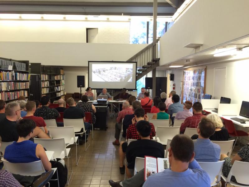ONE Archives housed an insightful presentation and dialogue with Alan Bell, Andy Rutkowski, and Cynthia Wang. Speakers engaged the audience with a conversation about the evolution of storytelling and connection. Rutkowski spoke of his research of known and little known LGBTQ landmarks using the Damron Guide as his starting point. Wang shared the innovative GlobaltraQs, a web-based application that maps out LGBTQ stories throughout history around the world. Bell took audiences back to the 80s and shared his experiences in reaching out and mapping queer spaces. The event closed with the audience participating in mapping their personal queer terrain.