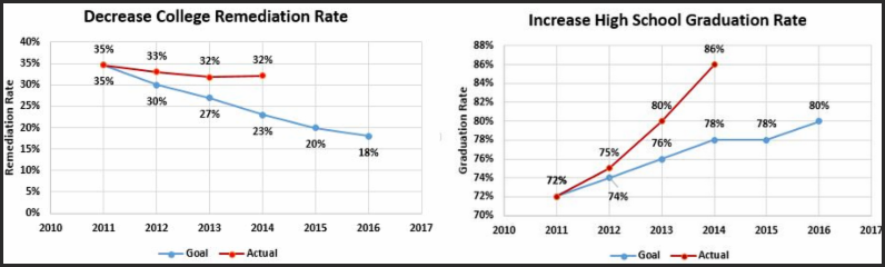 The State Department of Education has set goals for increasing the percentage of students that graduate from high school and goals for increasing the percentage of those students who are college ready, work and who are not in need of remediation.
