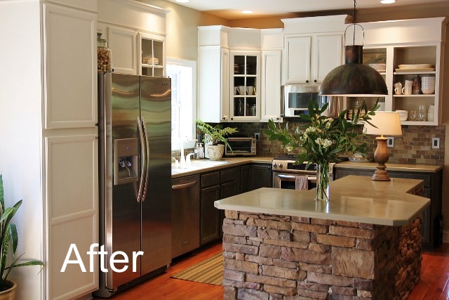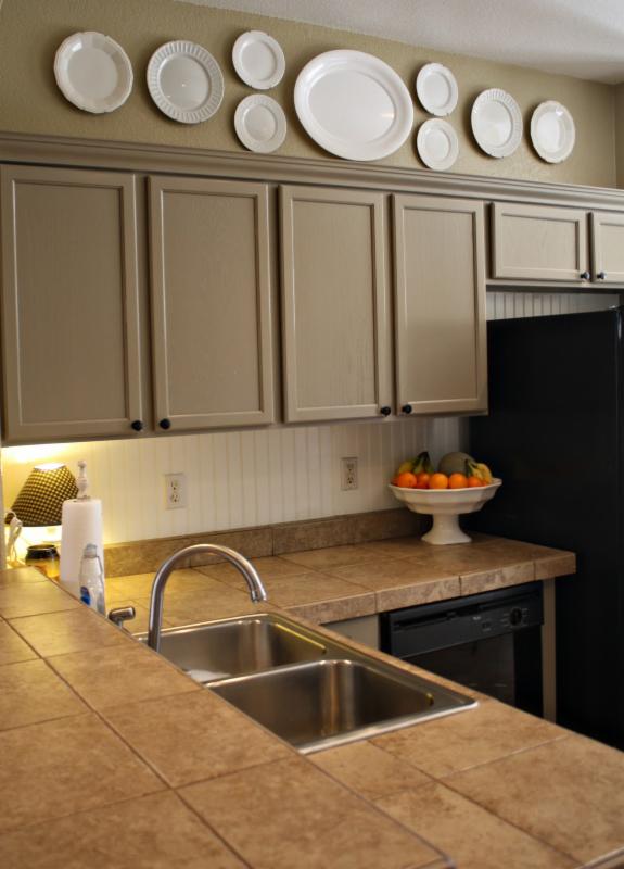 I often get asked, "What should I put on top of my kitchen cabinets?", Almost always I want to say, "Nothing!" Just because it's a ledge doesn't mean you have to put something on it. I often see kitchens that display way too many items. It looks busy and chaotic, especially if the items are not "related". But I have to say, the worst offense of all, are the green vines across the tops of the cabinets. Using them will certainly date you from the 90's. Worst of all, they collect dust and show it...and they look fake! While I'm not oppose to some "greenery" up there, vines are out. Most of the time, nothing at all is the best choice.