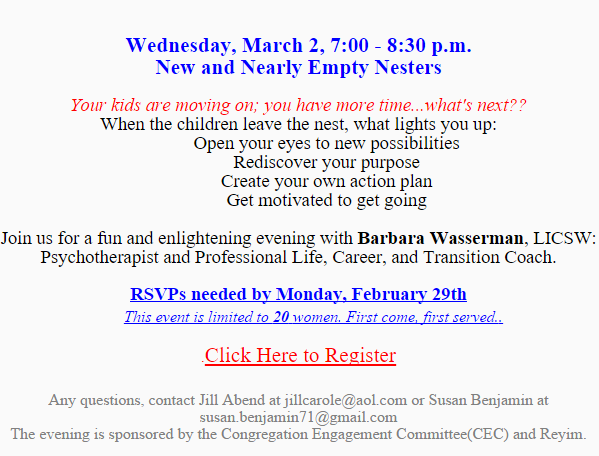 March 6, 9:00 a.m. Join us for our second Congregation Community brunch hosted by the Congregation Engagement Committee. Get together with old friends and make new friends in a warm and friendly environment over hot scrambled eggs and coffee, and other nosh.