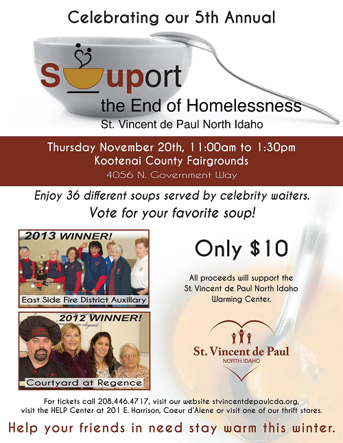 This is the perfect weather to head to the Kootenai County Fairgrounds in Coeur d'Alene for lunch to enjoy a friendly soup competition featuring more than 30 soups, with funds going to help the homeless in our community. Be sure to vote for your favorite soup! Cost is only $10 to benefit the St. Vincent de Paul Warming Center. Tickets can be purchased at the door.