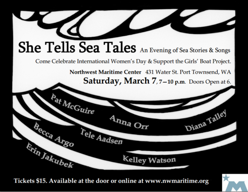 March 7, She Tells Sea Tales, An Evening of Sea Stories & Songs at the Northwest Maritime Center, 7-10 pm.